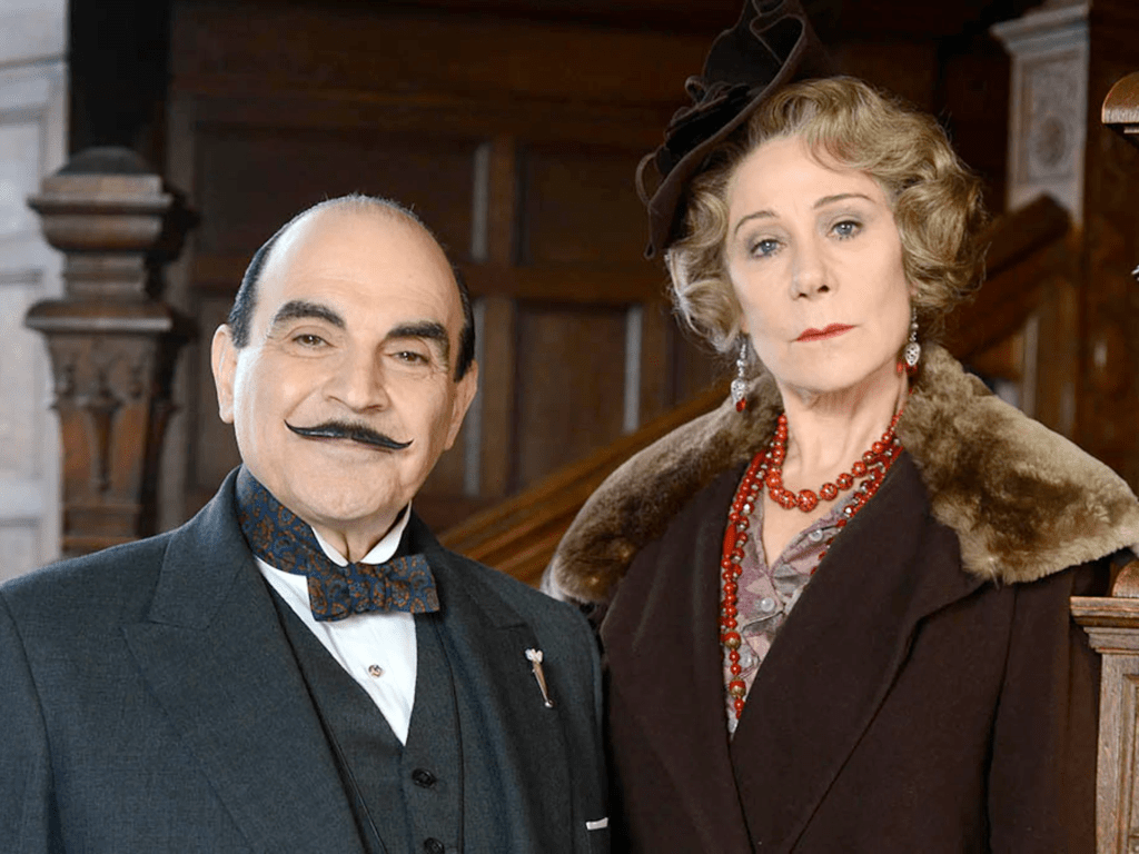Publicity still from Elephants Can Remember, season 13 of Agatha Christie’s Poirot. David Suchet as Poirot; Zoë Wanamaker as crime writer Ariadne Oliver.